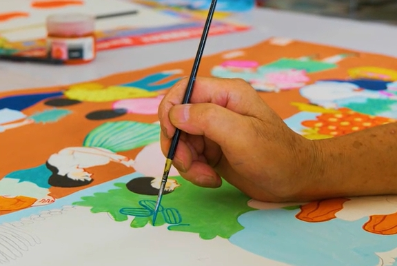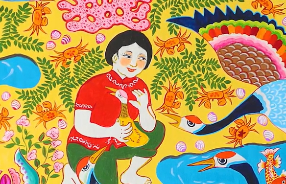 射陽(yáng)農(nóng)民畫起源于上世紀(jì)50年代,一些農(nóng)民在耕作之余,自發(fā)地利用墻壁、黑板,開始創(chuàng)作壁畫、漫畫,直接描繪現(xiàn)實(shí)生活中的新人新事。射陽(yáng)縣農(nóng)民畫以現(xiàn)代民間藝術(shù)為基礎(chǔ),吸取了剪紙、版畫、年畫、刺繡的造型方法和表現(xiàn)手法,采取大膽夸張的浪漫主義創(chuàng)作方法,設(shè)色熱烈明麗,構(gòu)圖飽滿奇異,體現(xiàn)出“多、滿、善、愛(ài)”的意境和理想,創(chuàng)作中能極大地顯現(xiàn)出主觀表現(xiàn)意趣和濃郁的鄉(xiāng)土氣息。1993年,射陽(yáng)縣被國(guó)家文化部命名為“中國(guó)現(xiàn)代民間繪畫畫鄉(xiāng)”。